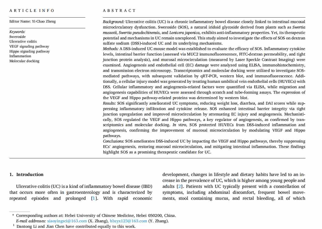 Sweroside ameliorates intestinal mucosal microcirculatory disturbances in ulcerative colitis mice by modulating the VEGF and Hippo signaling pathways